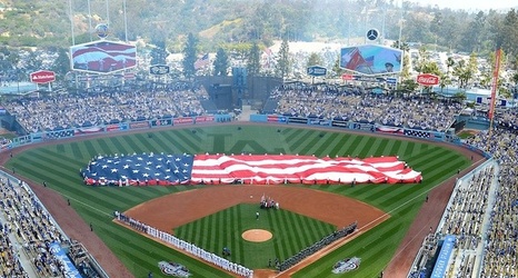 [Chavez Ravine, Los Angeles] Opening day is always a special event in major league baseball. At Dodger stadium or “the ravine” it takes on significance due to the team and their tie to the city. The fact the Dodgers would be hosting their arch-rival Giants was enough for most fans. But the treat about opening day is you never know what presentations the host team will unveil.