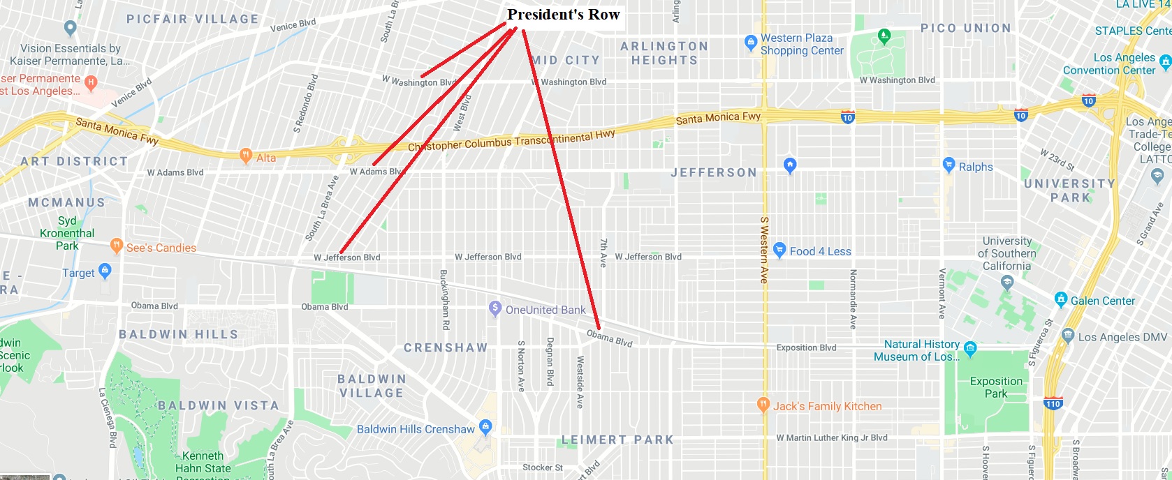 Many Angelenos, even natives do not know about this factoid. Quite simply, president’s row starts from Washington (George Washington) Blvd. which is immediately north of the Santa Monica freeway so now the next four intersections going south are part of the row. Washington Blvd., Adams Blvd. (John Adams), Jefferson Blvd. (Thomas Jefferson) and now Obama Blvd. You can find this iconic part of the city by going south on any of the following thoroughfares; Arlington, Crenshaw and La Brea.