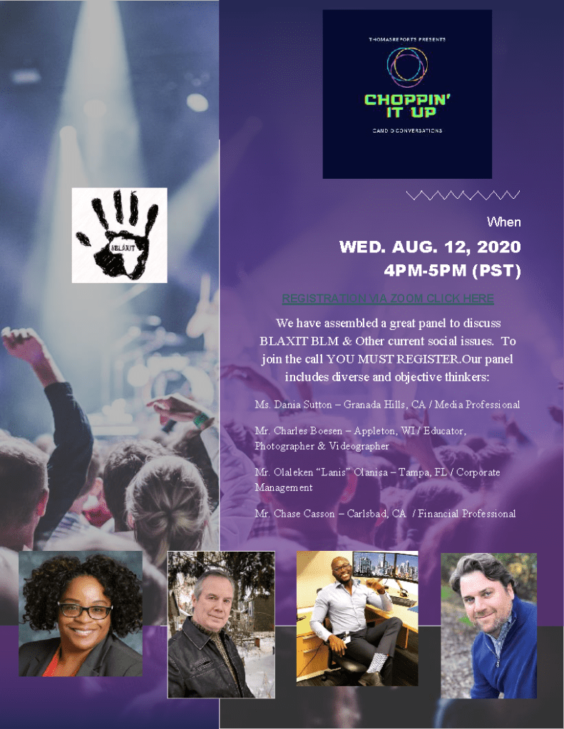 Choppin’ it up – Candid Conversations Series August 10, 2020August 11, 2020 ~ Fred Thomas, III ~ Leave a comment To attend event you must register. Simply click on HERE Share this: Click to print (Opens in new window) Print Tweet Click to email a link to a friend (Opens in new window) Email Click to share on Reddit (Opens in new window) Reddit Click to share on WhatsApp (Opens in new window) WhatsApp Share on TumblrLike Loading...