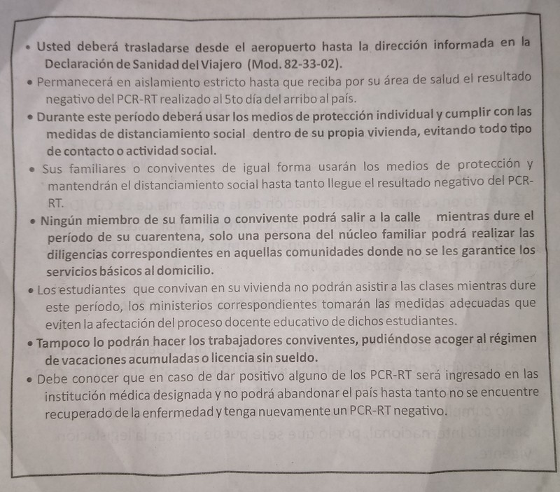5. Once it is your turn, you will be directed to staff seated at tables. They will inspect your form and assuming it is correct you will be handed a form which spells out what you must do because as soon as you depart the airport you must go to your designed casa or place you have indicated for mandatory quarantine.