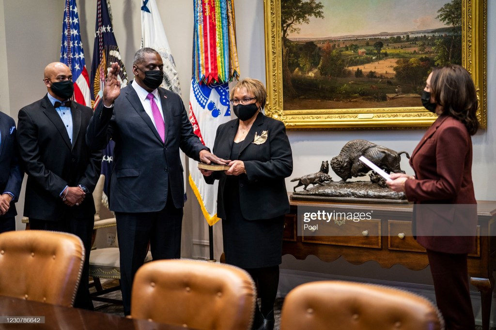 WASHINGTON, DC – JANUARY 25: Secretary of Defense Lloyd Austin (2nd L) participates in a ceremonial swearing-in with U.S. Vice President Kamala Harris (R) in the Roosevelt Room of the White House on January 25, 2021 in Washington, DC. On Monday, President Biden signed an executive order repealing the ban on transgender people serving openly in the military. Austin was previously commander of the U.S. Central Command in the Obama administration. (Photo by Doug Mills-Pool/Getty Images)