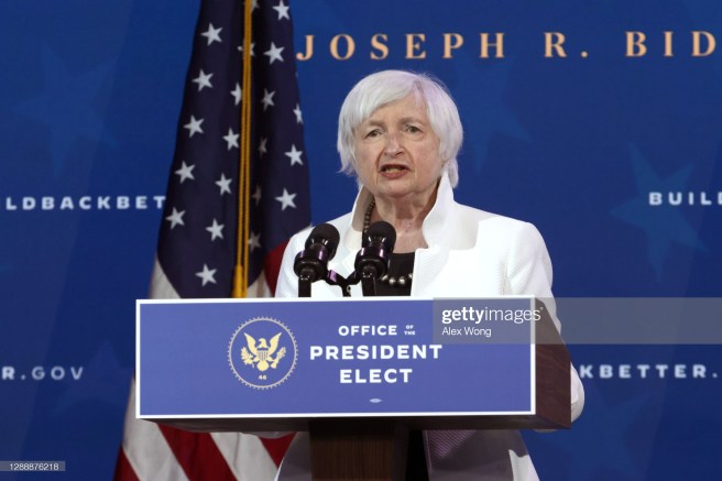 WILMINGTON, DELAWARE – DECEMBER 01: U.S. Secretary of the Treasury nominee Janet Yellen speaks during an event to name President-elect Joe Biden’s economic team at the Queen Theater on December 1, 2020 in Wilmington, Delaware. Biden is nominating and appointing key positions to the Treasury Department, Office of Management and Budget, and the Council of Economic Advisers. (Photo by Alex Wong/Getty Images)