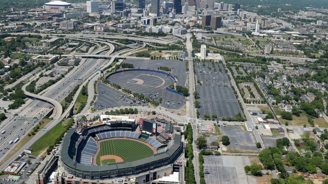 Turner Field with diamond layout of Fulton County stadium and site where Aaron’s blast landed.