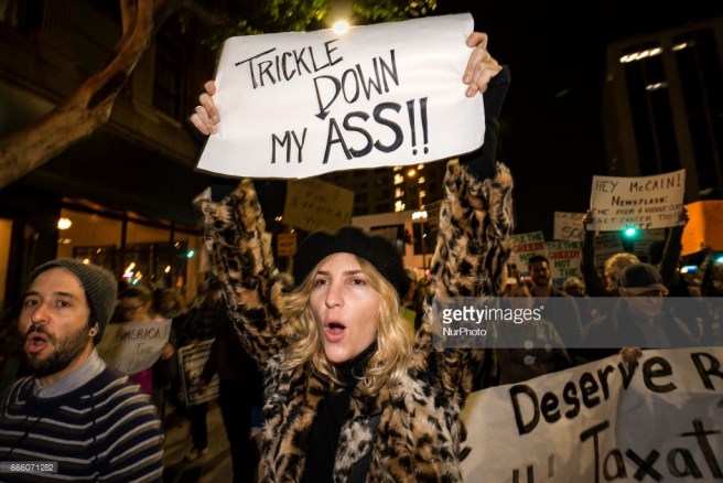 People take part in a protest against the Republican tax bill in Los Angeles, California on December 4, 2017. Democrats and many economists warn that the GOP tax plan gives large tax cuts to corporations and the wealthy and will hurt middle class families. (Photo by Ronen Tivony/NurPhoto)
