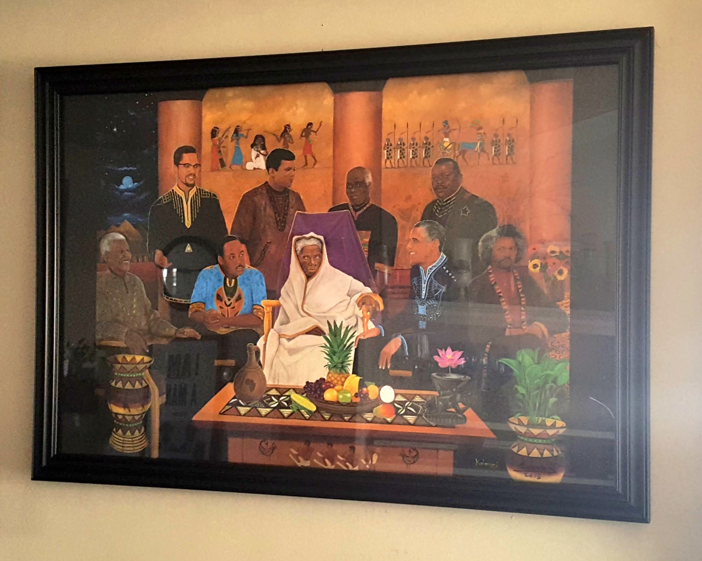It depicts President Barack Obama during a meeting. He was summoned by the ancestors to discuss issues of importance to the African American community and the best path forward for our people. The ancestors that summoned him were Marcus Garvey, Harriet Tubman, Malcolm X, Frederick Douglass, Martin Luther King Jr, Dr. John Henrik Clarke, Nelson Mandela and Muhammad Ali.