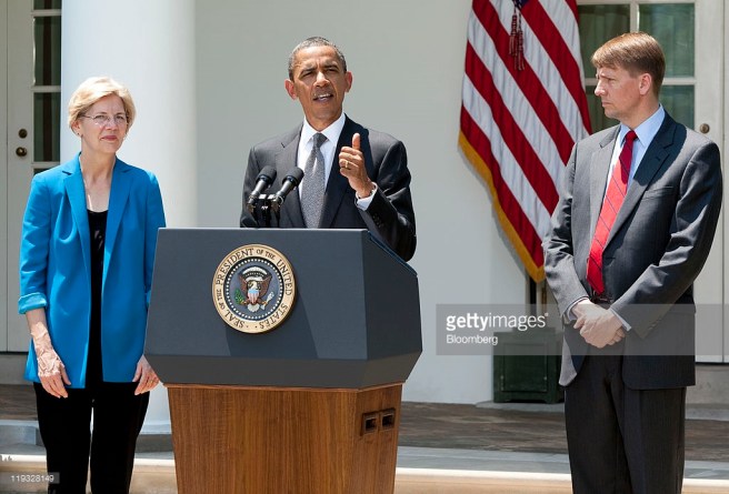 U.S. President Barack Obama nominates Richard Cordray a former attorney general of Ohio to lead the Consumer Financial Protection Bureau as Elizabeth Warren, the Obama administration adviser who is setting up the new Consumer Financial Protection Bureau, listens during an announcement at the White House in Washington, D.C., U.S., on Monday, July 18, 2011. Photographer: Joshua Roberts/Bloomberg
