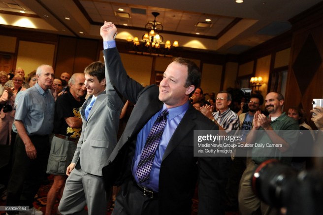 Jared Polis, front, celebrates. (Photo by Josh Lawton/Digital First Media/Boulder Daily Camera via Getty Images)