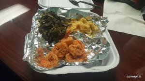 Lunch special – Fried Shrimp – Mac & Cheese and Greens