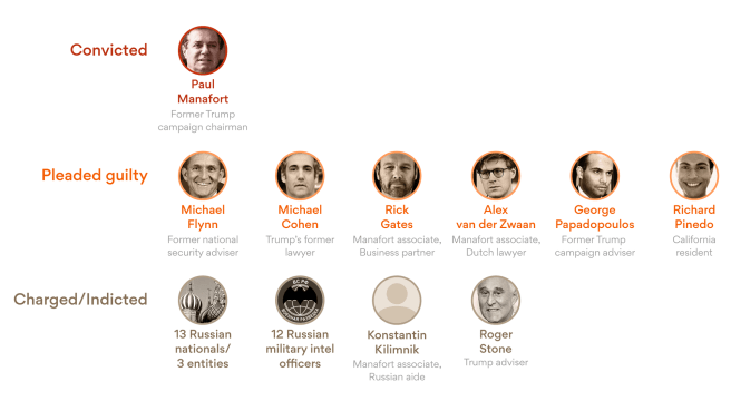 Unfortunately, like a heartbeat the throbbing question remains and deserves some type of legitimate response. It becomes a bit silly when Donald Trump and his supporters belt-out their choral refrain “There’s No Collusion, There’s No Russia interference!!!” Yet, all of the lads listed below have suffered the wrath of being entangled in the legal system investigating Donald Trump.